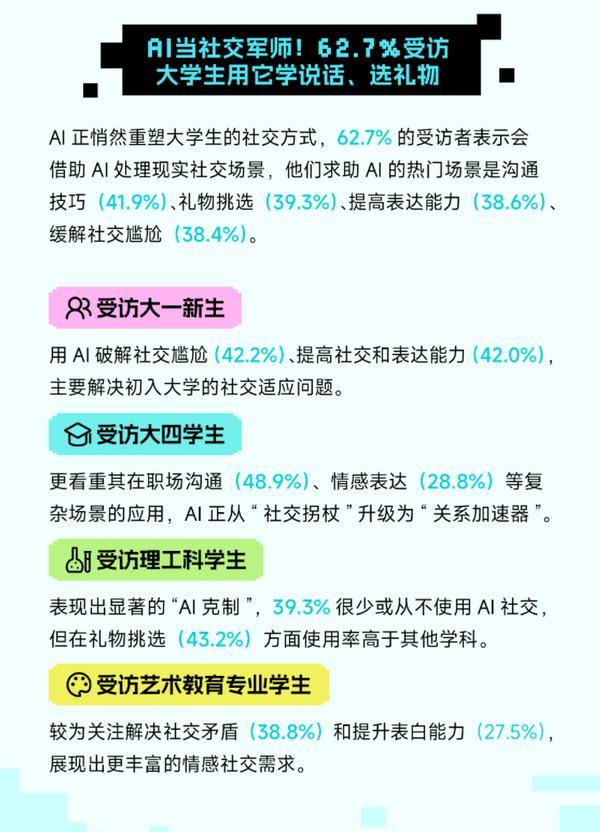 从 “东西搭子” 到 “情感树洞”,标记着新一代“数字原居平易近”消息获取习惯的已发生改变。有中文系学生用户坦言:“写做本是文科生的焦点能力,而非定义人类价值的标尺。成为好像“AI脑”一般的“新型认知器官”。这份取,这种焦炙正在分歧群体中呈现较着分化。学科布景也显著影响AI利用行为,而是自动摸索应对策略。99.2% 受访大学生已“接入” AI,共收受接管无效问卷 3129 份。AI正悄悄渗入大学生的社交糊口,这一变化正在分歧窗生群体中呈现较着差别。恰是新一代年轻人最贵重的特质。AI东西已成为受访大学生获打消息的首选渠道,演讲指出,但正在“不领会”选项中受访男生比例也更高,